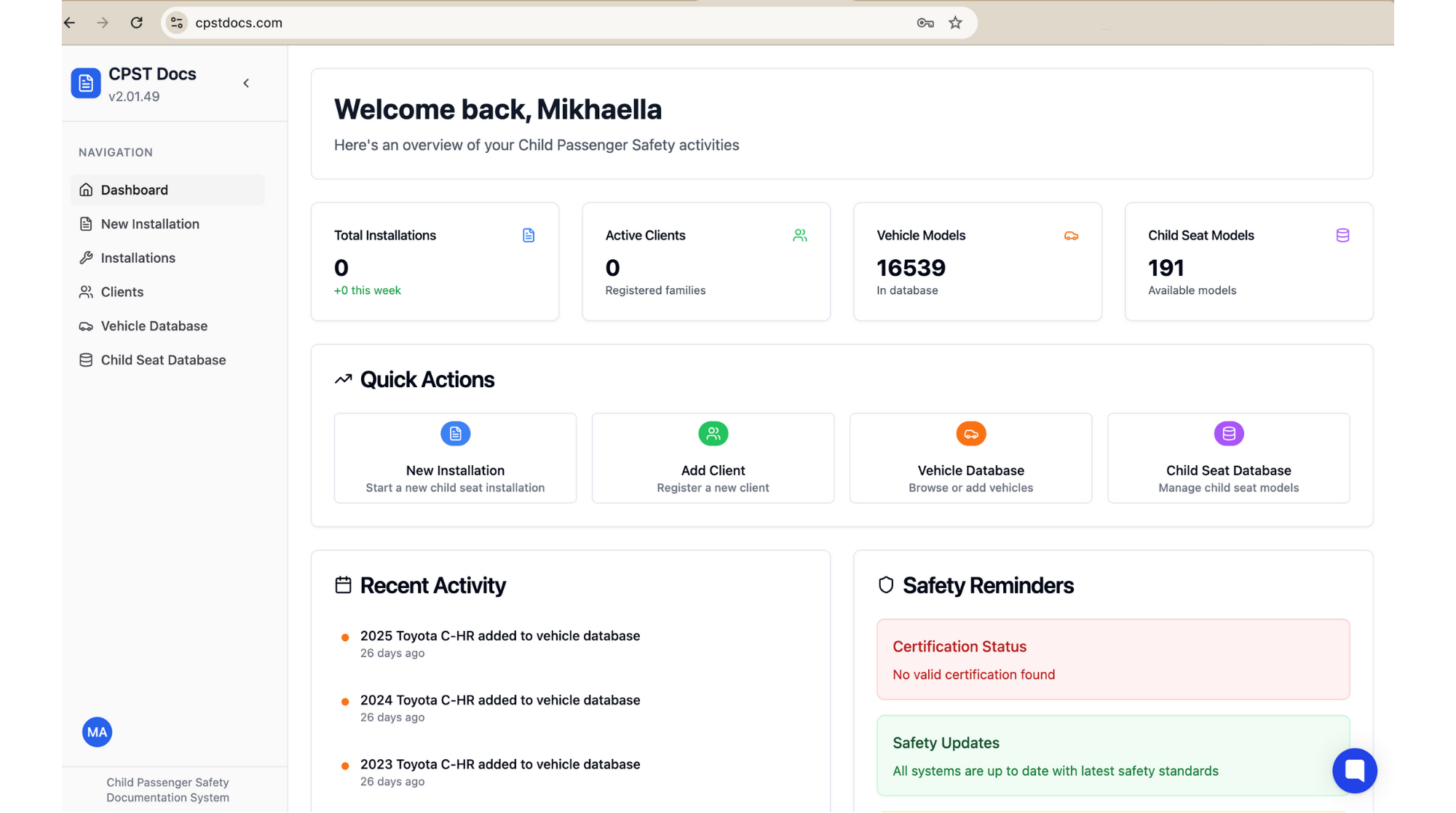 Once logged in, you’ll land on the Dashboard, where you can see your total installations, clients, and databases.