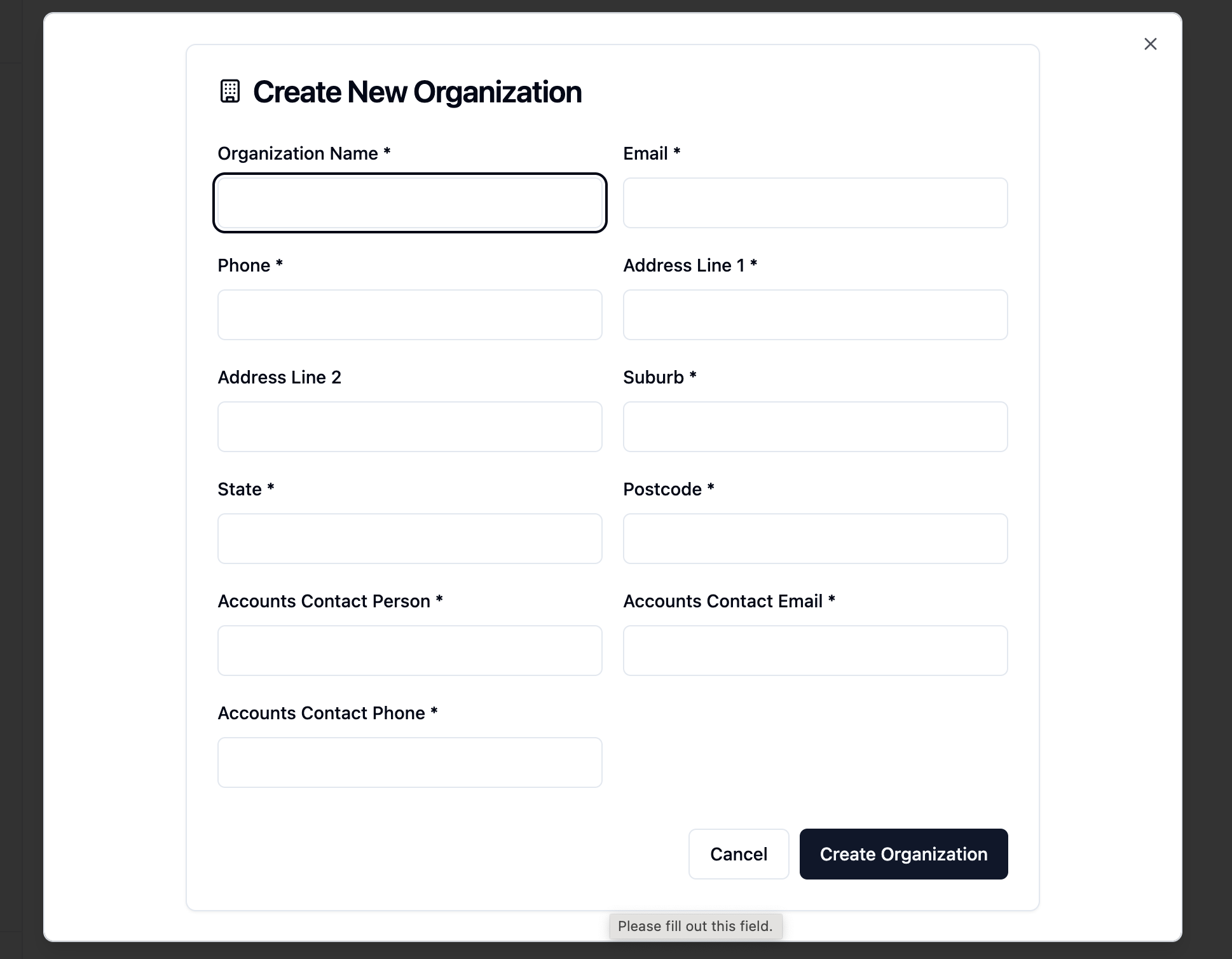 Create or review your details and update them if needed (e.g., organisation name, contact details). Then click Create Organisation.